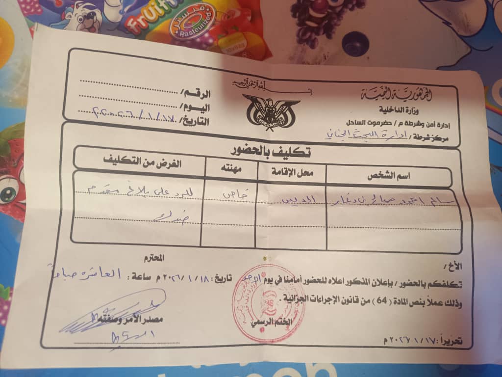 تعرض الناشط السياسي الحضرمي، الزميل سالم أحمد صالح بن دغار، وهو عضو الجمعية الوطنية بالمجلس الانتقالي الجنوبي، وعضو في الحركة الوطنية النضالية لتحرير الجنوب، والذي ينحدر من منطقة الديس، تعرض لملاحقة أمنية همجية من قبل أمن ساحل حضرموت. جاء ذلك بعد أن قام زميلنا بن دغار، بقراءة البيان السياسي للمسيرة الجماهيرية الحاشدة التي أُقيمت في..." />